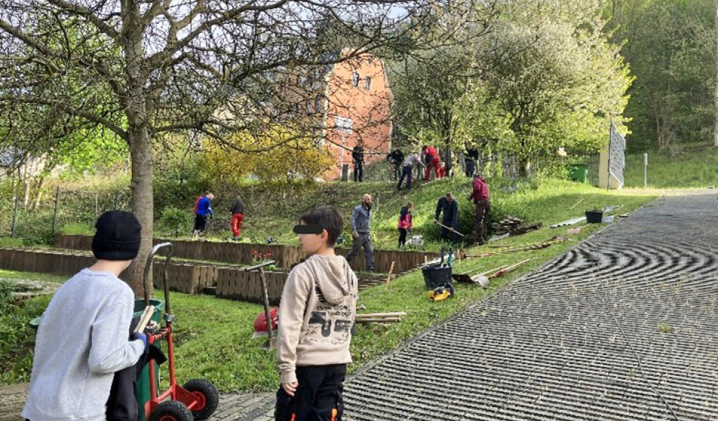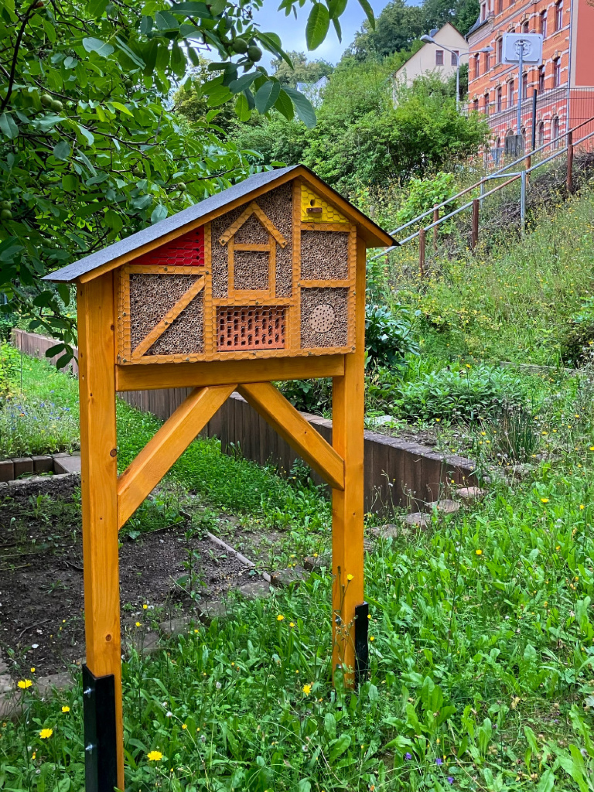 Die ersten Tipps wurden bei einem Arbeitseinsatz mit der Elternschaft umgesetzt. Es wurde ein Insektenhotel aufgestellt und Vorbereitungen für eine Benjeshecke getroffen. Spezielle Pflanzen, die Nahrung für Insekten bieten, stellte Wolfgang Wagner zur Verfügung. Diese sind gut angewachsen, blühen schon und vermehren sich hoffentlich tüchtig.